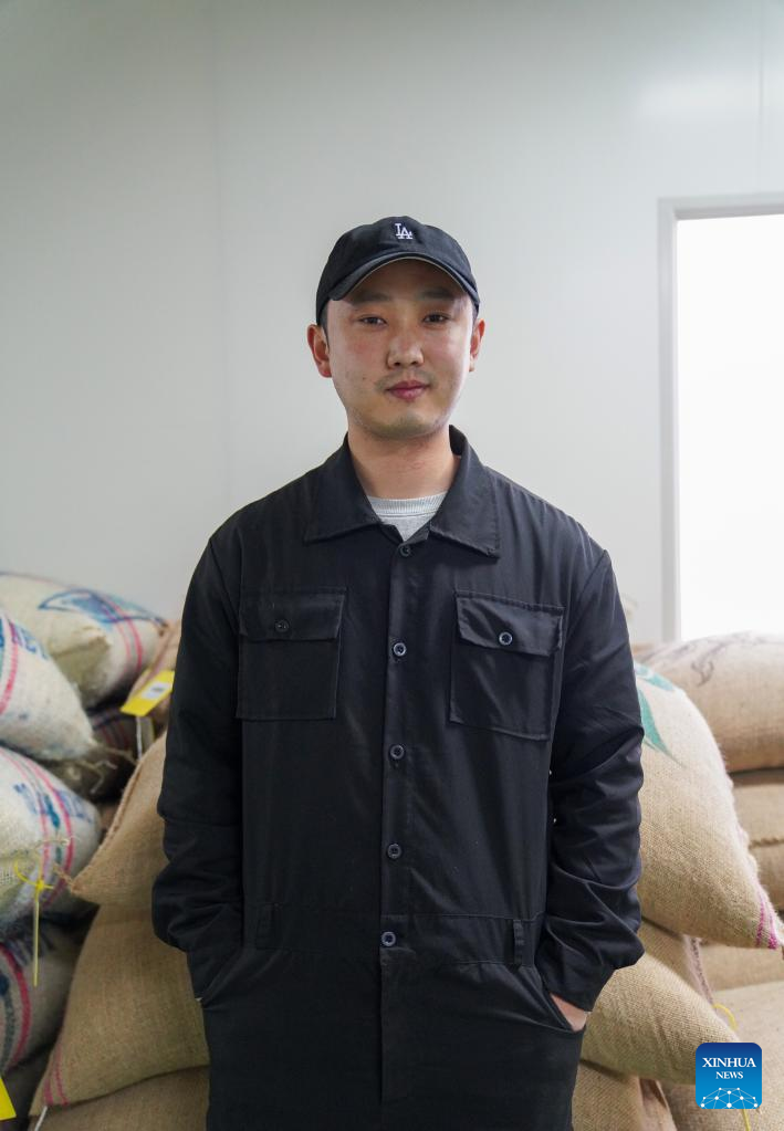 Jiang Jingtai poses for a photo in Yanji, Yanbian Korean Autonomous Prefecture, northeast China's Jilin Province. Jiang Jingtai, coffee roaster of a food processing company in Yanji, has been engaging in the coffee industry for 9 years. Considering the continuous development of coffee consumption market in Yanji and the increasing demand for roasted coffee beans, Jiang Jingtai decided to change his career from a barista to a coffee roaster. The coffee bean processing factory, which Jiang Jingtai works for, roasts about 500 kilograms of coffee beans every day, covering the supplies of dozens of cafes in Yanbian Korean Autonomous Prefecture. The northeastern border city of Yanji in Yanbian Korean Autonomous Prefecture has witnessed a spark of coffee trend as over 540 coffee shops are registered in the 680,000 dwellers city in recent years. According to the data from Meituan Waimai, a major food delivery platform in China, Yanji ranked first in coffee consumption among counties (including county-level cities) in China from January to February this year. (Xinhua/Yan Linyun)