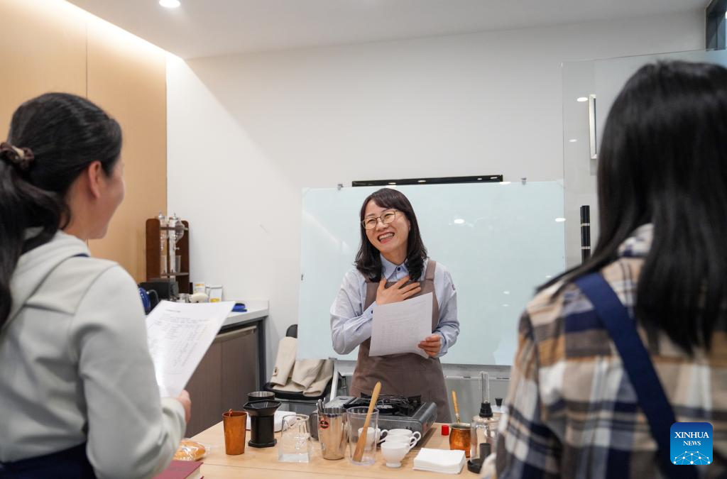 Huang Chunshan conducts training on coffee in Yanji, Yanbian Korean Autonomous Prefecture, northeast China's Jilin Province 2023. The northeastern border city of Yanji in Yanbian Korean Autonomous Prefecture has witnessed a spark of coffee trend as over 540 coffee shops are registered in the 680,000 dwellers city in recent years. According to the data from Meituan Waimai, a major food delivery platform in China, Yanji ranked first in coffee consumption among counties (including county-level cities) in China from January to February this year. (Xinhua/Yan Linyun)