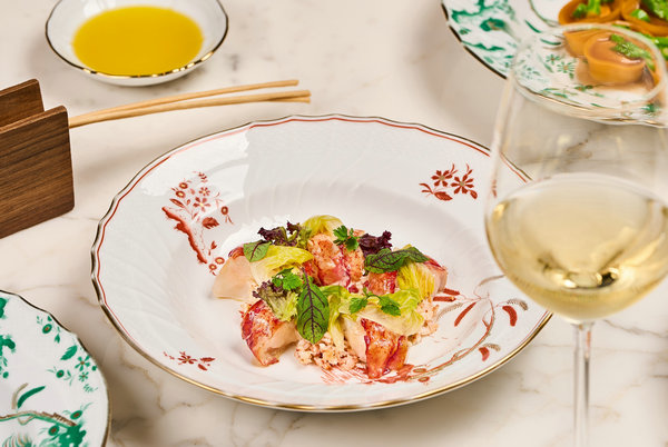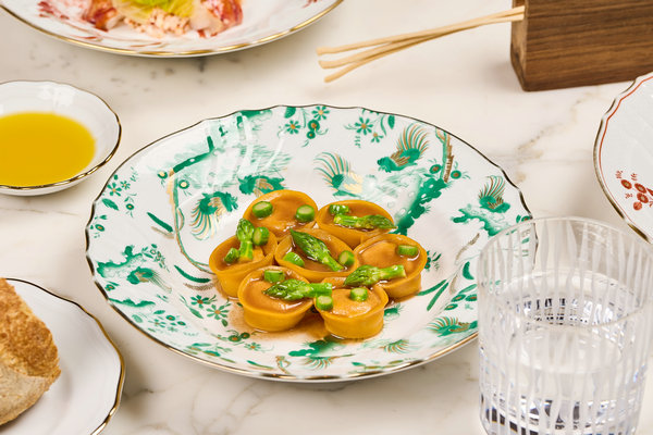Handmade langoustine tortellini with asparagus. [Photo provided to China Daily]