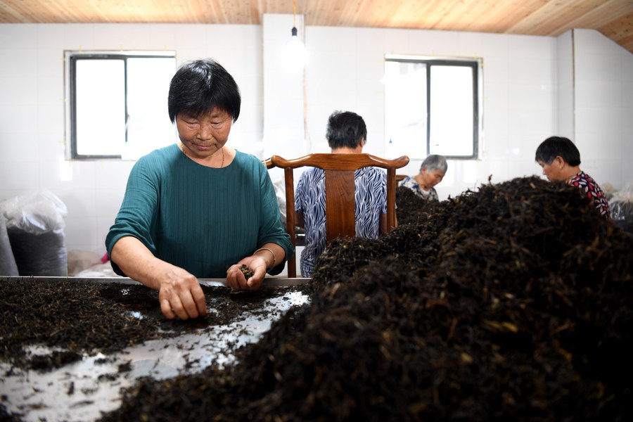 A worker selects Yixian dark tea at a studio in Yixian county, East China's Anhui province, July 30, 2021. [Photo/Xinhua]