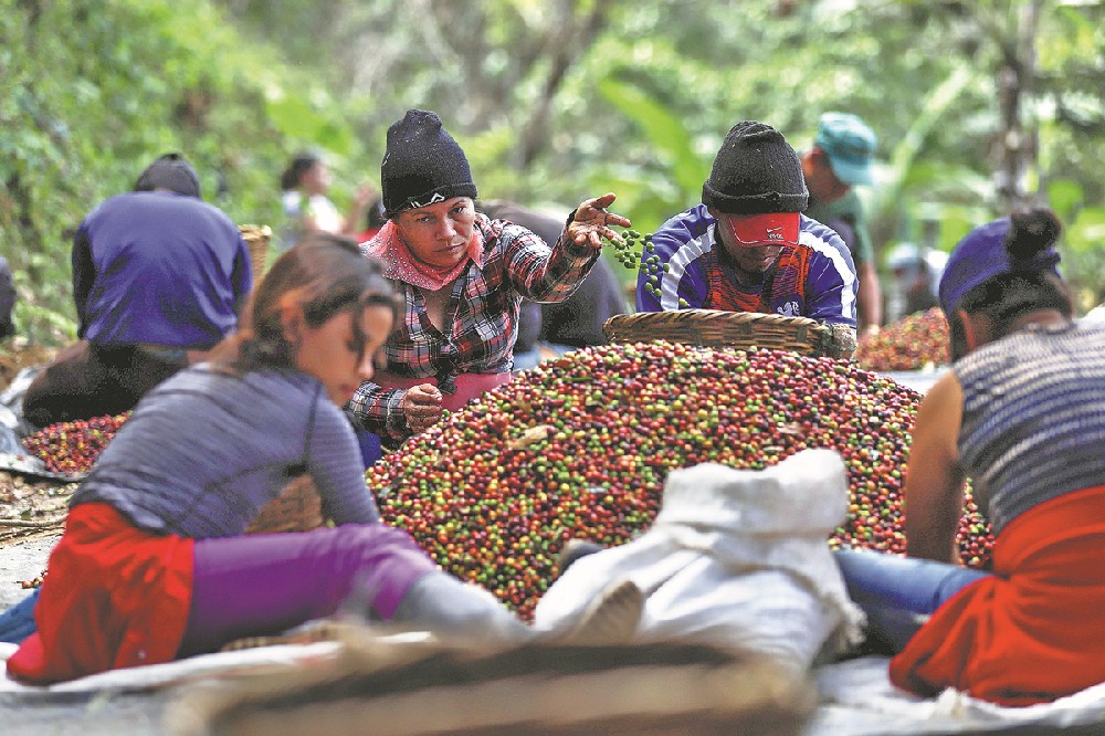 Workers process coffee beans in a field in El Paraiso, Honduras, in January. [EMILIO FLORES/GETTY IMAGES]