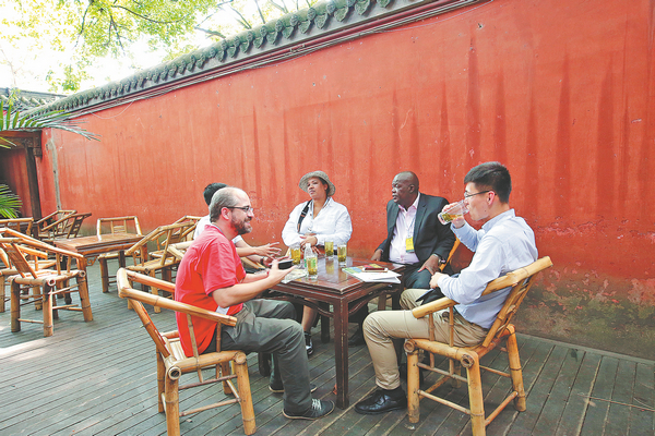 Foreign visitors sip their favorite tea at a teahouse located near the Wuhou Shrine in Chengdu.