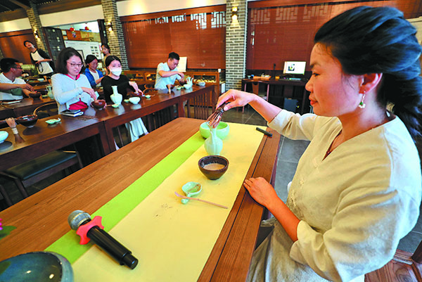 A teacher shares tea rituals of the Southern Song Dynasty (1127-1279) with visitors at Jingshan village in Hangzhou, Zhejiang province, earlier this month. [PHOTO BY ZHANG WEI/CHINA DAILY]