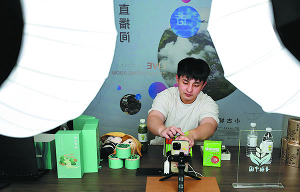 A tea vendor prepares for a livestream sale session in Jingshan village earlier this month. [PHOTO BY ZHANG WEI/CHINA DAILY]