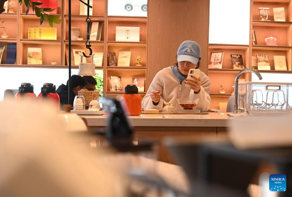 People drink tea in the Shangxiahang traditional block in Fuzhou, southeast China's Fujian Province.
