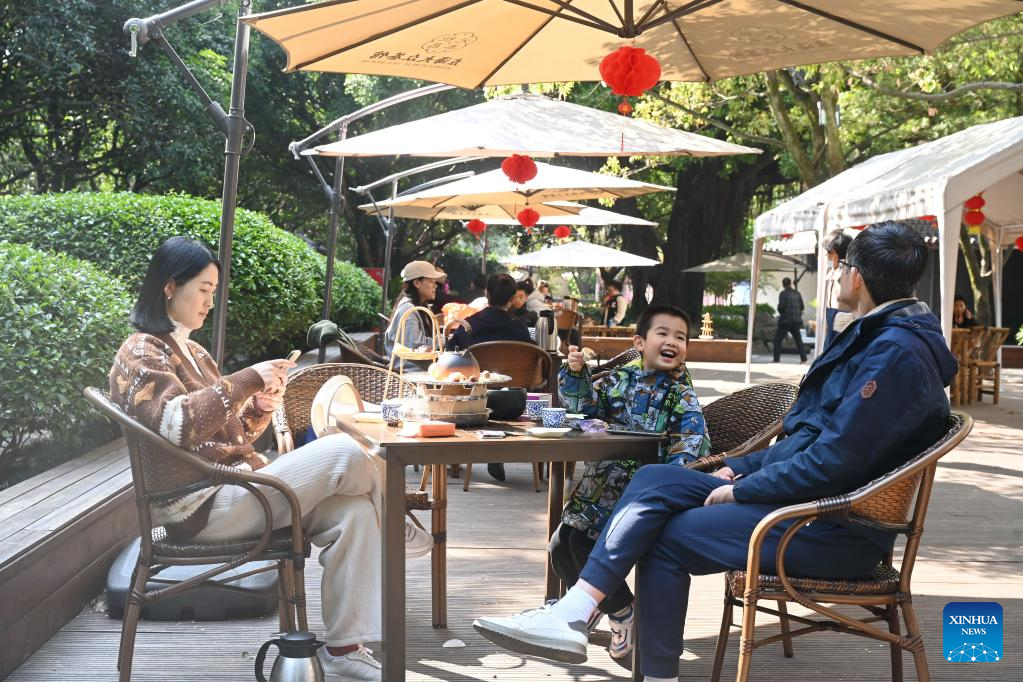 People enjoy their leisure time at an outdoor tea house in Zuohai Park in Fuzhou, southeast China's Fujian Province.