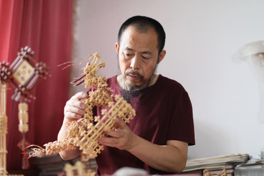Zhao Runsheng, a craftsman, makes a work of art using sorghum straw in his workroom in the Jingxing mining area of Shijiazhuang, Hebei province. [Photo provided to chinadaily.com.cn]