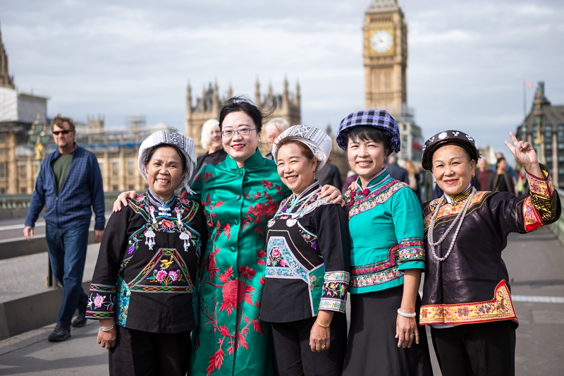 Xia Hua (second from left) and female embroiderers pose for a photo while they attended a fashion show in London in 2017 (COURTESY PHOTO)