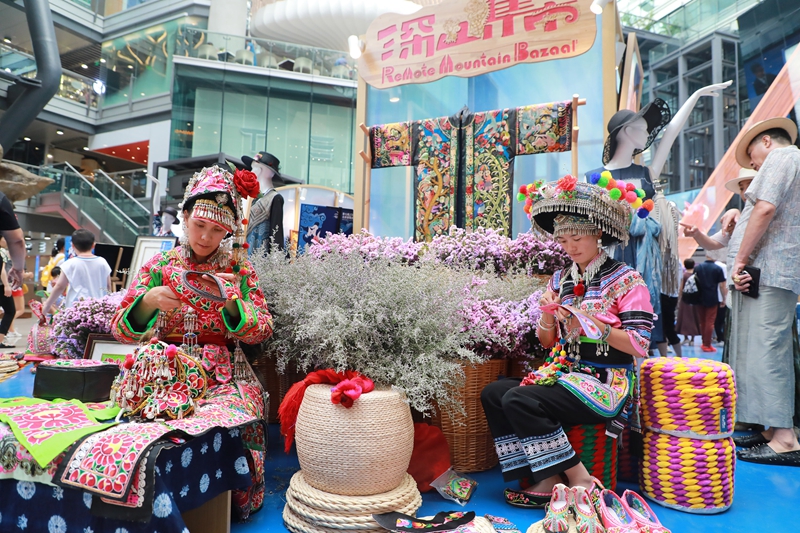 Miao embroiderers showcase their craftsmanship at the Remote Mountain Bazaar hosted by Eve Group in a mall in Beijing in 2019 (XINHUA)