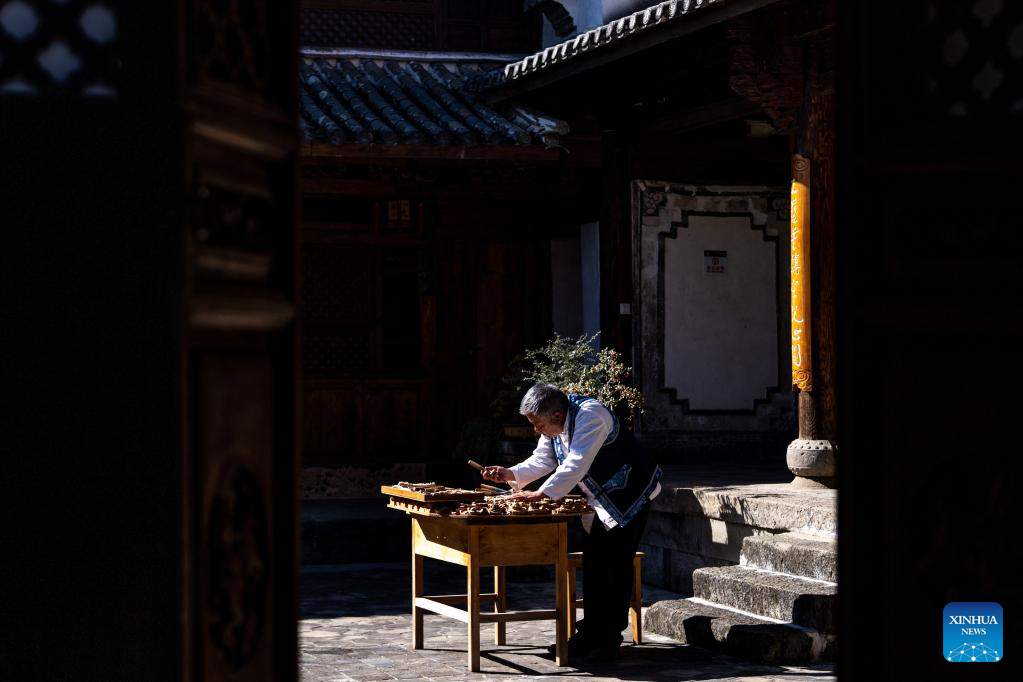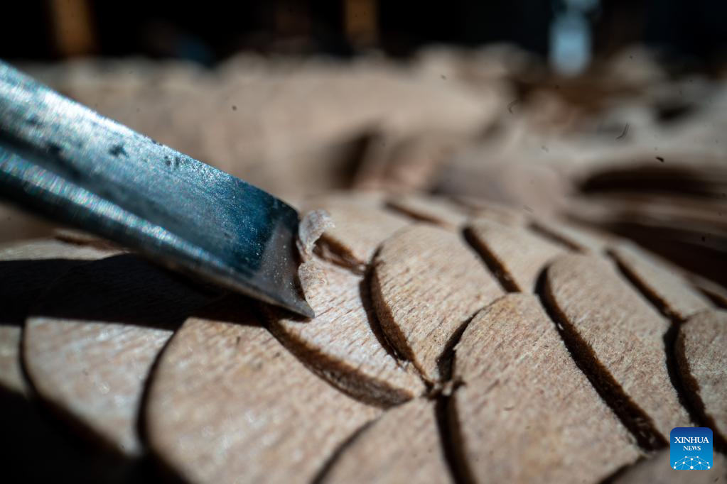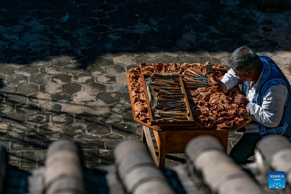 Duan Sixing waxes on his woodcarving work in Jianchuan County, Dali Bai Autonomous Prefecture of southwest China's Yunnan Province, Dec. 2, 2022. Jianchuan County, located in Dali Bai Autonomous Prefecture of southwest China's Yunnan Province, has a long history in woodcarving dating back to the Tang (618-907) and Song (960-1279) dynasties. The carving skills gradually developed from one-layer relief to even seven-layer hollowing relief, and are now applied to making architecture parts, wooden furniture, wall paintings and tourism souvenirs. A high-standard "Four Screens", a representative displaying form of the craft, requires high-level carving skills and costs several months to create. In 2011, Jianchuan woodcarving was listed as one of China's national-level intangible cultural heritages.