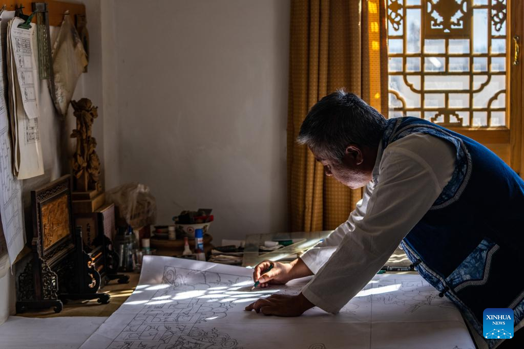 Duan Sixing draws woodcarving patterns at his studio in Jianchuan County, Dali Bai Autonomous Prefecture of southwest China's Yunnan Province, Dec. 2, 2022. Jianchuan County, located in Dali Bai Autonomous Prefecture of southwest China's Yunnan Province, has a long history in woodcarving dating back to the Tang (618-907) and Song (960-1279) dynasties. The carving skills gradually developed from one-layer relief to even seven-layer hollowing relief, and are now applied to making architecture parts, wooden furniture, wall paintings and tourism souvenirs. A high-standard "Four Screens", a representative displaying form of the craft, requires high-level carving skills and costs several months to create. In 2011, Jianchuan woodcarving was listed as one of China's national-level intangible cultural heritages.
