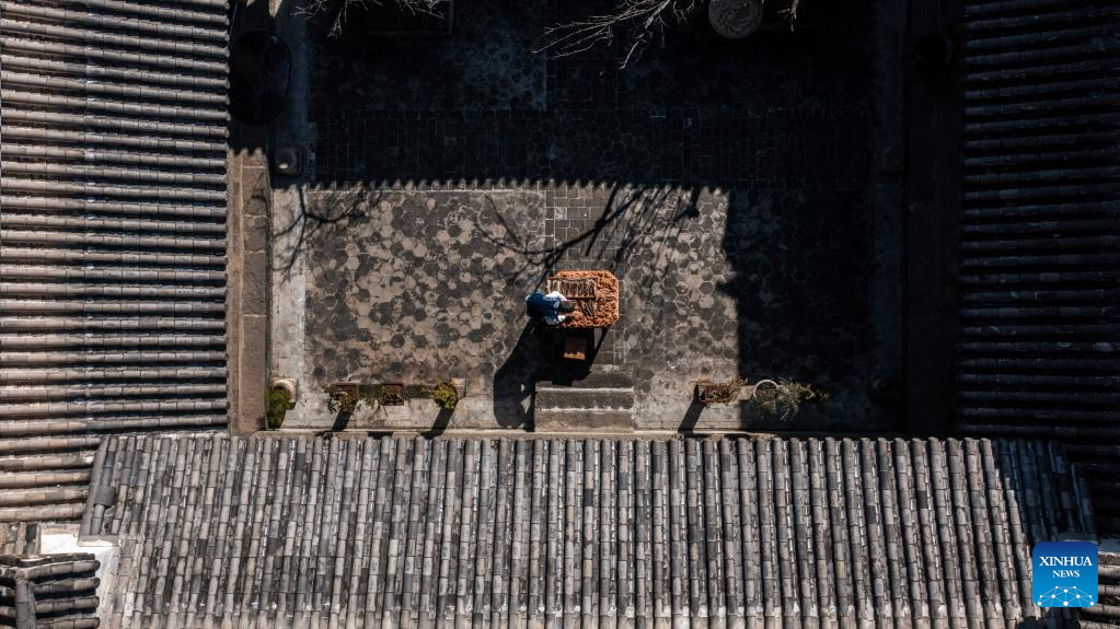This aerial photo shows Duan Sixing making a woodcarving work in Jianchuan County, Dali Bai Autonomous Prefecture of southwest China's Yunnan Province, Dec. 1, 2022. Jianchuan County, located in Dali Bai Autonomous Prefecture of southwest China's Yunnan Province, has a long history in woodcarving dating back to the Tang (618-907) and Song (960-1279) dynasties. The carving skills gradually developed from one-layer relief to even seven-layer hollowing relief, and are now applied to making architecture parts, wooden furniture, wall paintings and tourism souvenirs. A high-standard "Four Screens", a representative displaying form of the craft, requires high-level carving skills and costs several months to create. In 2011, Jianchuan woodcarving was listed as one of China's national-level intangible cultural heritages.