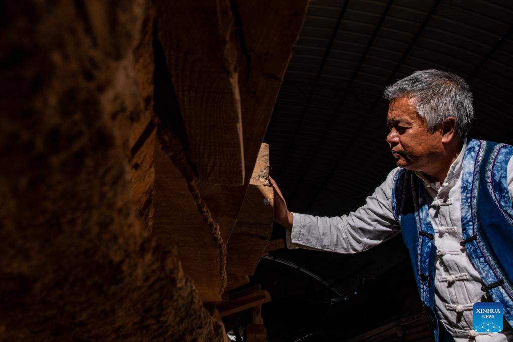 Duan Sixing checks at the construction site of his woodcarving museum in Jianchuan County, Dali Bai Autonomous Prefecture of southwest China's Yunnan Province, March 11, 2023. Jianchuan County, located in Dali Bai Autonomous Prefecture of southwest China's Yunnan Province, has a long history in woodcarving dating back to the Tang (618-907) and Song (960-1279) dynasties. The carving skills gradually developed from one-layer relief to even seven-layer hollowing relief, and are now applied to making architecture parts, wooden furniture, wall paintings and tourism souvenirs. A high-standard "Four Screens", a representative displaying form of the craft, requires high-level carving skills and costs several months to create. In 2011, Jianchuan woodcarving was listed as one of China's national-level intangible cultural heritages.