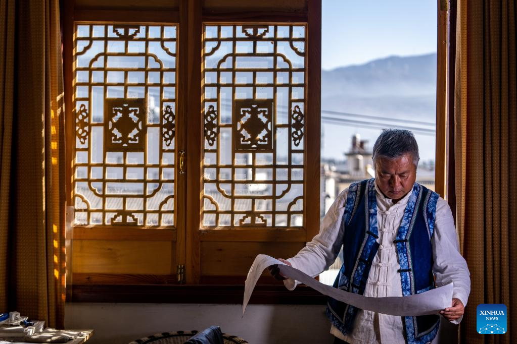 Duan Sixing checks on woodcarving patterns at his studio in Jianchuan County, Dali Bai Autonomous Prefecture of southwest China's Yunnan Province, Dec. 2, 2022. Jianchuan County, located in Dali Bai Autonomous Prefecture of southwest China's Yunnan Province, has a long history in woodcarving dating back to the Tang (618-907) and Song (960-1279) dynasties. The carving skills gradually developed from one-layer relief to even seven-layer hollowing relief, and are now applied to making architecture parts, wooden furniture, wall paintings and tourism souvenirs. A high-standard "Four Screens", a representative displaying form of the craft, requires high-level carving skills and costs several months to create. In 2011, Jianchuan woodcarving was listed as one of China's national-level intangible cultural heritages.