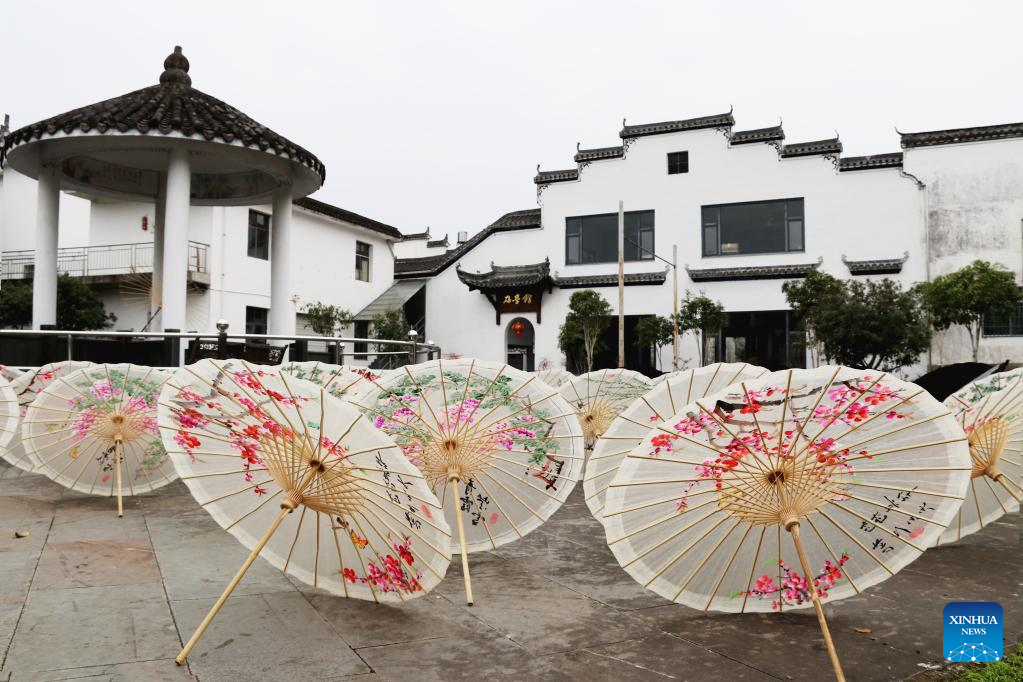 This photo taken shows oil-paper umbrellas at a factory making Jialu oil-paper umbrella, a traditional Chinese handicraft with a history of over 800 years, in Wuyuan County, east China's Jiangxi Province. (Xinhua/Liu Yang)