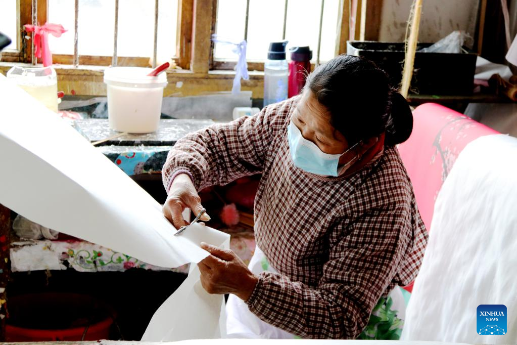 NANCHANG, March 24 (Xinhua) -- In a factory in east China's Jiangxi Province, Zhang Shunnyu is busy making a traditional oil-paper umbrella, pasting the processed paper onto an umbrella frame and trimming the edges.