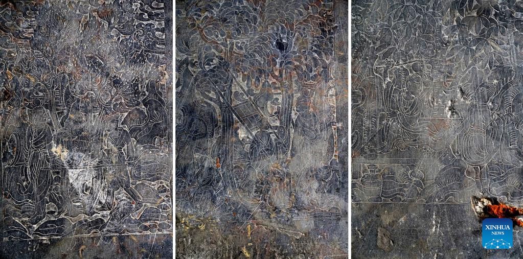 This combo photo taken on March 15, 2023 shows the images on the stone folding screens of stone beds unearthed in a cemetery found in Zhucang Village in Mengjin District of Luoyang City, central China's Henan Province. A cemetery consisting of three tombs was recently listed as one of the five key archaeological discoveries in Henan Province in 2022. In the tombs probably built between the late period of the Northern Wei Dynasty (386-534) and the Eastern Wei Dynasty (534-550), large-scale and well-organized stone beds with stone folding screens were found. This is the first time that stone beds dating back to this period have been unearthed in Luoyang City. (Xinhua/Li An)