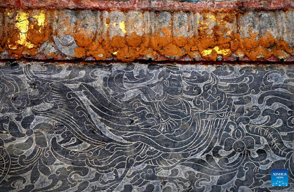 This photo taken on March 15, 2023 shows the image on a stone bed unearthed in a cemetery found in Zhucang Village in Mengjin District of Luoyang City, central China's Henan Province. A cemetery consisting of three tombs was recently listed as one of the five key archaeological discoveries in Henan Province in 2022. In the tombs probably built between the late period of the Northern Wei Dynasty (386-534) and the Eastern Wei Dynasty (534-550), large-scale and well-organized stone beds with stone folding screens were found. This is the first time that stone beds dating back to this period have been unearthed in Luoyang City. (Xinhua/Li An)