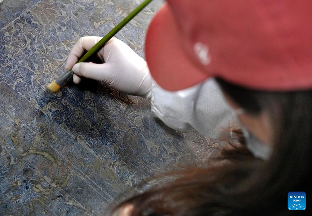 This photo taken on March 15, 2023 shows a staff member cleaning a stone folding screen of a stone bed unearthed in a cemetery found in Zhucang Village in Mengjin District of Luoyang City, central China's Henan Province. A cemetery consisting of three tombs was recently listed as one of the five key archaeological discoveries in Henan Province in 2022. In the tombs probably built between the late period of the Northern Wei Dynasty (386-534) and the Eastern Wei Dynasty (534-550), large-scale and well-organized stone beds with stone folding screens were found. This is the first time that stone beds dating back to this period have been unearthed in Luoyang City. (Xinhua/Li An)