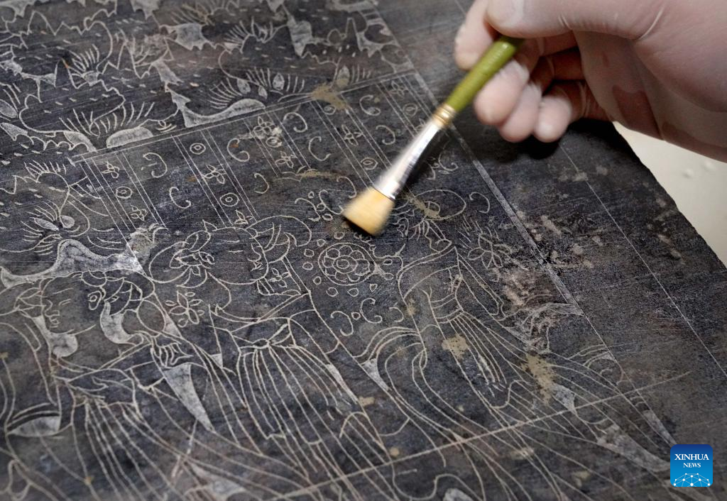 A staff member cleans a stone folding screen of a stone bed unearthed in a cemetery found in Zhucang Village in Mengjin District of Luoyang City, central China's Henan Province, March 15, 2023. A cemetery consisting of three tombs was recently listed as one of the five key archaeological discoveries in Henan Province in 2022. In the tombs probably built between the late period of the Northern Wei Dynasty (386-534) and the Eastern Wei Dynasty (534-550), large-scale and well-organized stone beds with stone folding screens were found. This is the first time that stone beds dating back to this period have been unearthed in Luoyang City. (Xinhua/Li An)