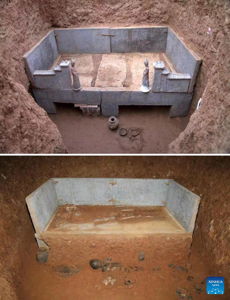 This combo photo shows a set of stone bed with stone folding screens unearthed in a cemetery found in Zhucang Village in Mengjin District of Luoyang City, central China's Henan Province. A cemetery consisting of three tombs was recently listed as one of the five key archaeological discoveries in Henan Province in 2022. In the tombs probably built between the late period of the Northern Wei Dynasty (386-534) and the Eastern Wei Dynasty (534-550), large-scale and well-organized stone beds with stone folding screens were found. This is the first time that stone beds dating back to this period have been unearthed in Luoyang City. (Luoyang Municipal Institute of Archaeology/Handout via Xinhua)