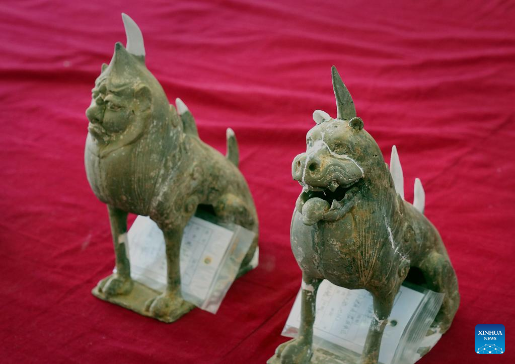 This photo taken on March 15, 2023 shows pottery tomb-guarding beasts unearthed in a cemetery found in Zhucang Village in Mengjin District of Luoyang City, central China's Henan Province. A cemetery consisting of three tombs was recently listed as one of the five key archaeological discoveries in Henan Province in 2022. In the tombs probably built between the late period of the Northern Wei Dynasty (386-534) and the Eastern Wei Dynasty (534-550), large-scale and well-organized stone beds with stone folding screens were found. This is the first time that stone beds dating back to this period have been unearthed in Luoyang City. (Xinhua/Li An)