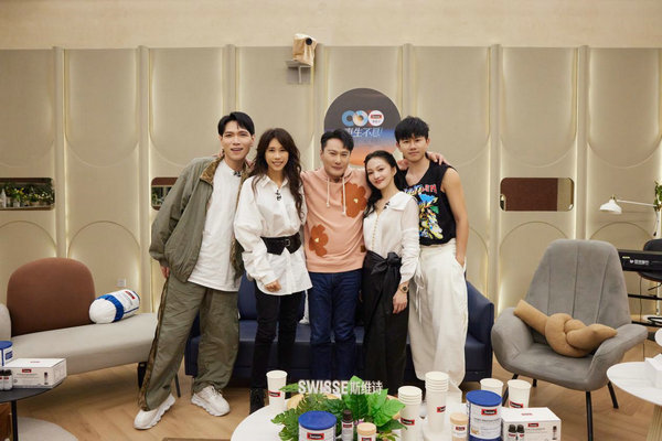 (From left to right) Singers Jam Hsiao, Karen Mok, Jeff Chang, Angela Zhang and Zhang Jie pose for a group photo. [Photo provided to China Daily]