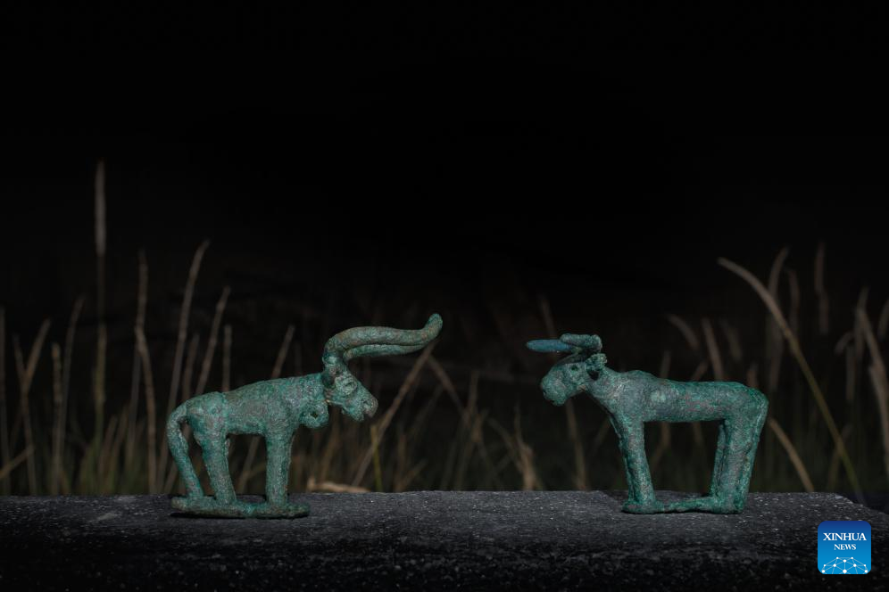 This undated photo provided by Qinghai provincial research academy of cultural heritage and archaeology shows bronzeware unearthed from the ruins located in Balong Township in Dulan County, northwest China's Qinghai Province. (Xinhua)