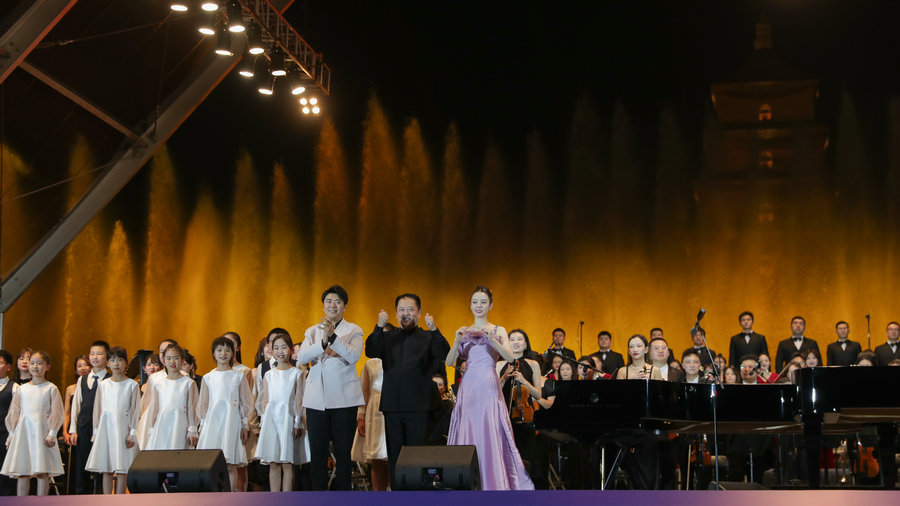 An outdoor concert by the Xi'an Symphony Orchestra by the Big Wild Goose Pagoda, a famous Buddhist pagoda built during the Tang Dynasty (618-907), in Xi'an, Shaanxi province, featuring pianists Lang Lang and Gina Alice, and conductor Ly Jia. [Photo provided to China Daily]