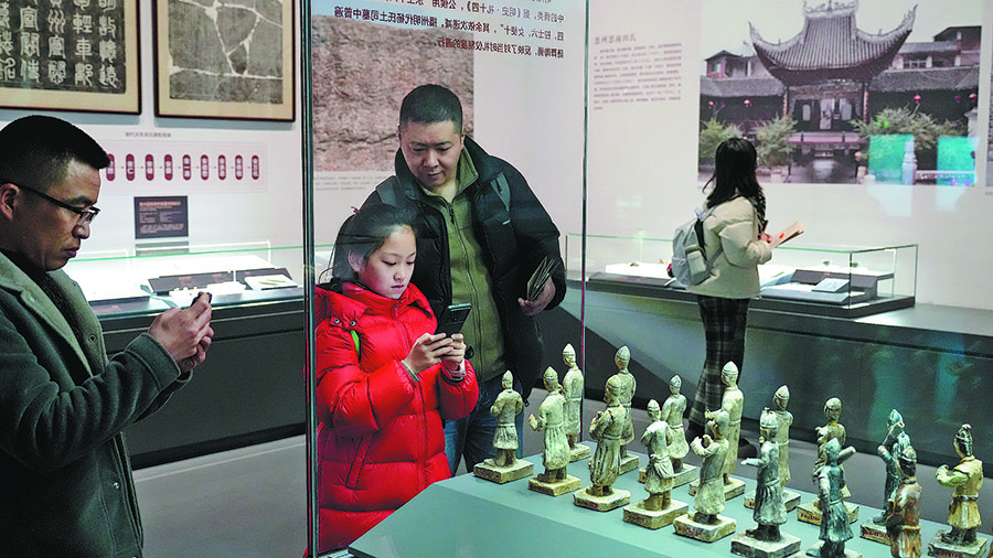 Visitors admire color-glazed pottery figurines from the Ming Dynasty (1368-1644) at Guizhou Provincial Museum. [Photo provided to China Daily]