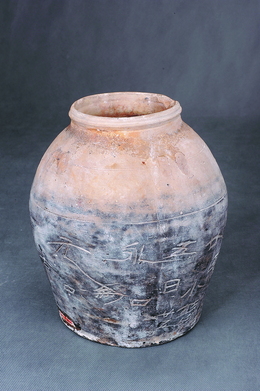 The fully glazed celadon jar has a small rim and bears an inscription indicating that it was made in AD 104. The jar, with its value inscribed on its surface, was used to hold sacrificial wine and is the first of its kind found in Guizhou that has an inscription.