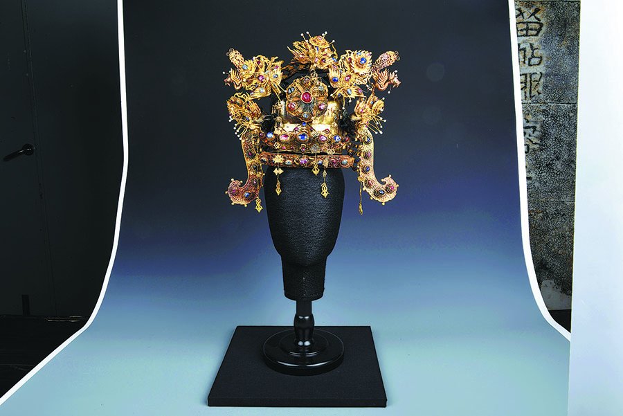 Among the highlights of the exhibition are a gold crown with inlaid gemstones from the Ming Dynasty. [Photo provided to China Daily]