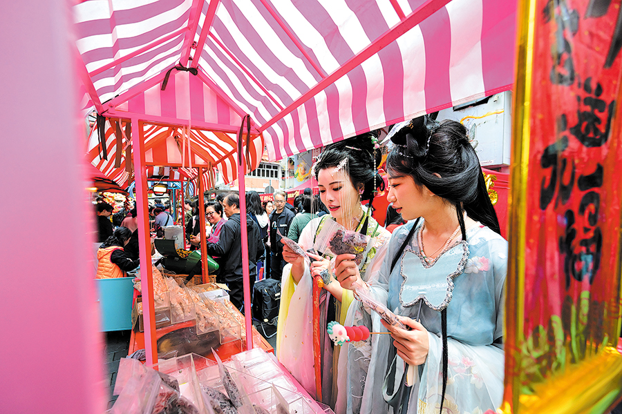 Hanfu lovers browse for snacks at a fair celebrating Spring Festival in Hong Kong on Feb 4. ZHU WEI/XINHUA