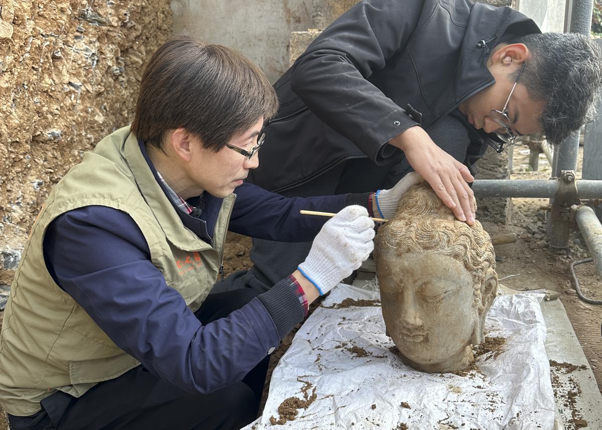 Archaeologists clean a stone Buddha head that was discovered at the Leigutai caves of the Longmen Grottoes in Luoyang, Henan province, in November. [Photo provided to China Daily]
