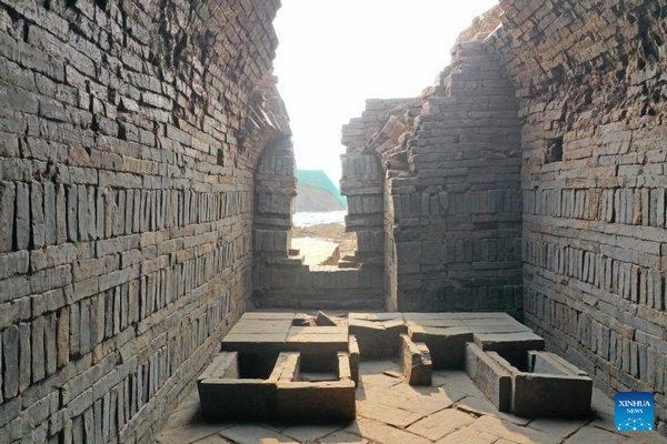 This undated photo provided by cultural relics and archaeology institute of Zhenjiang city shows an altar discovered at the brick chamber of a noble tomb in a cemetery dating back to the Six Dynasties period (222-589) in the city of Zhenjiang, East China's Jiangsu province. [Photo/Xinhua]