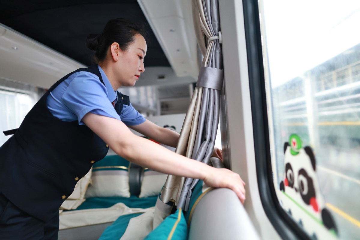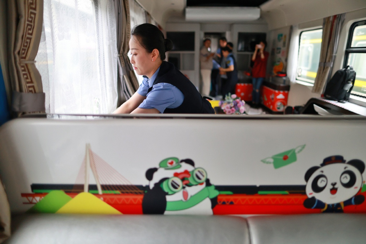 A train attendant prepares a "Panda Train" in Guiyang, Southwest China's Guizhou province, May 7, 2024. [Photo/Xinhua]