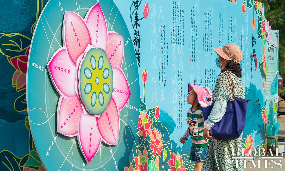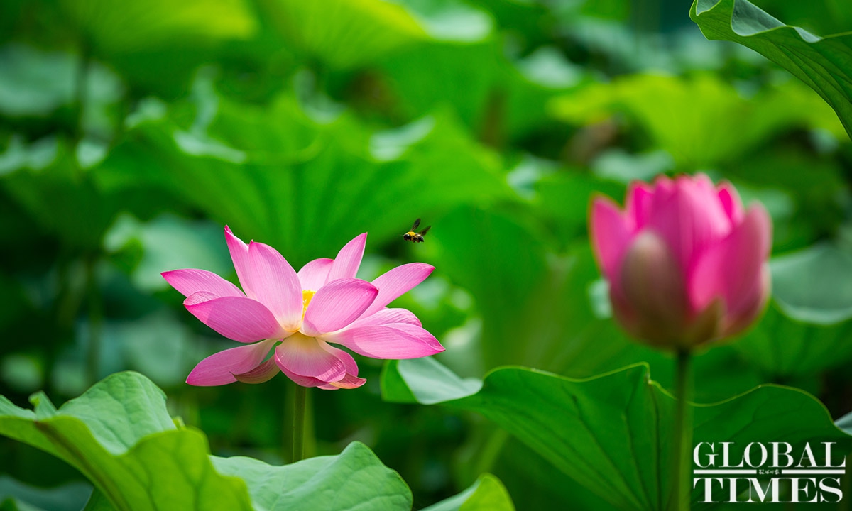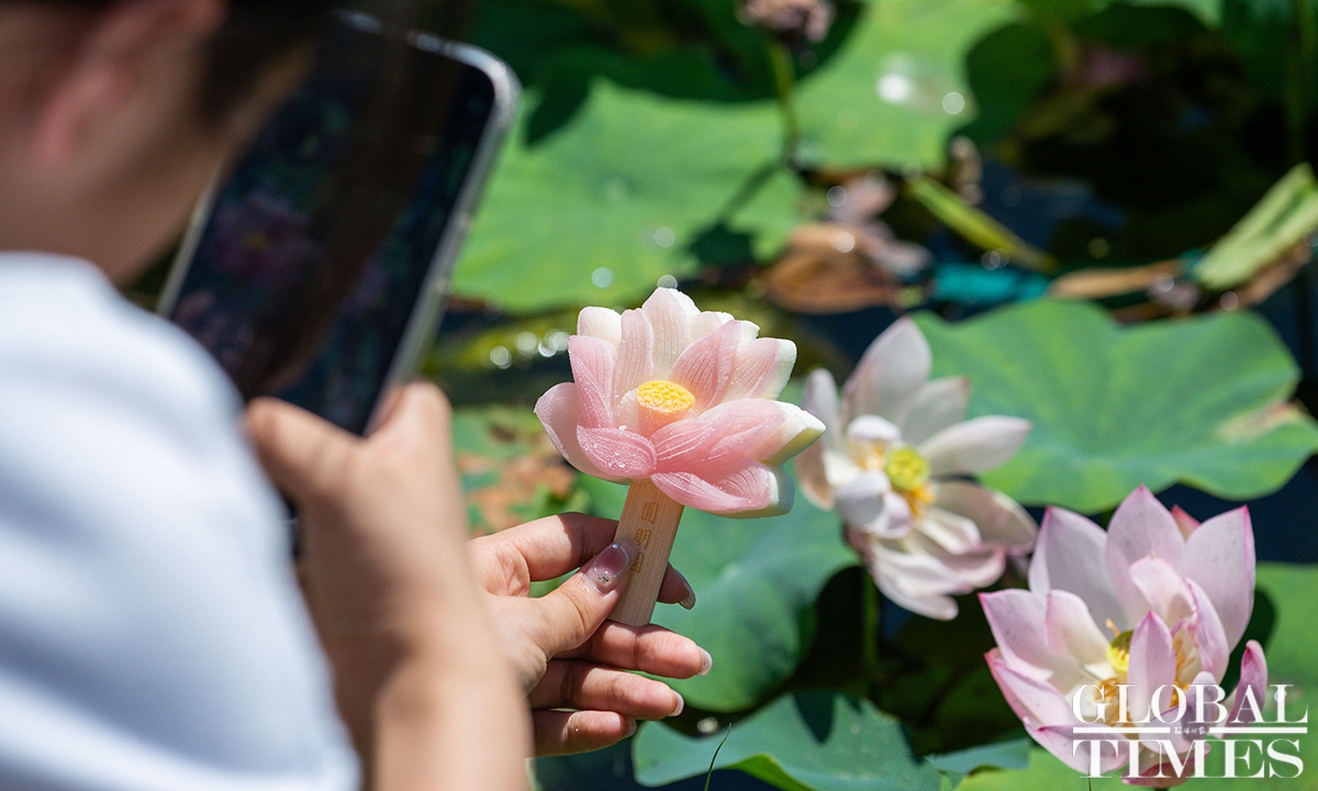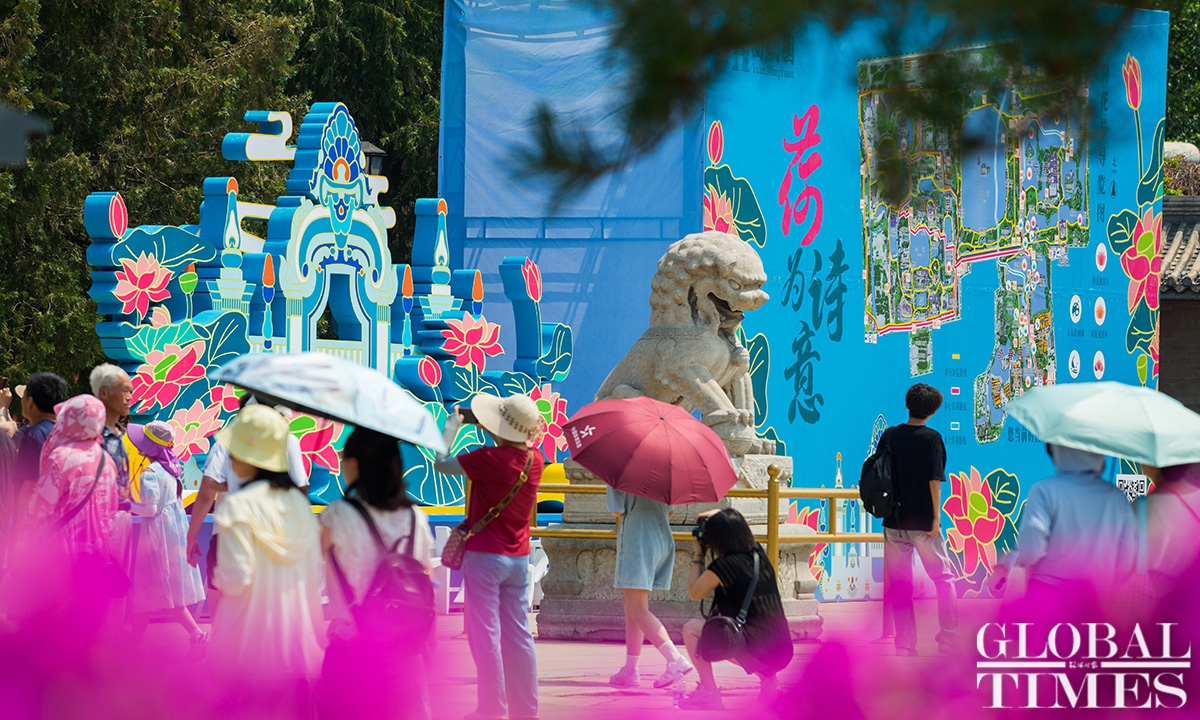 With the continuous high temperatures, lotus flowers in Beijing's parks are in full bloom, attracting lots of residents and tourists. Since April of this year, the average temperature around Beijing has been slightly higher than last year; this fact, coupled with the recent continuous high temperatures, caused the blooming period of lotus flowers to start half a month earlier. However, the peak blooming period is still expected to be in July and August.