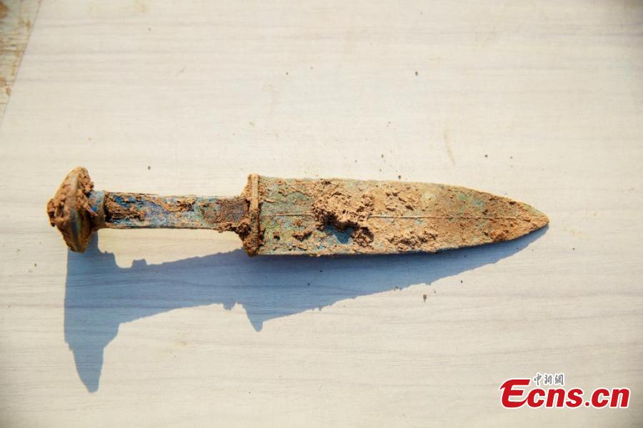 Photo released on Dec. 3, 2024, shows a bronze dagger discovered from a tomb complex dating from the Warring States period (475 BC-221 BC) to the Eastern Han Dynasty (25-220) in Luohe, central China's Henan Province. (China News Service/Yang Guang)