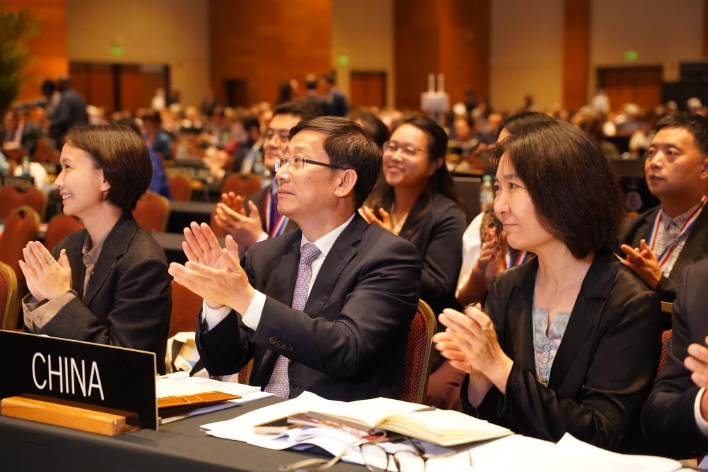 Chinese delegates celebrate during the 19th session of the Intergovernmental Committee for the Safeguarding of Intangible Cultural Heritage in Asuncion, Paraguay, Dec. 5, 2024. Three Chinese cultural elements, namely traditional Li textile techniques: spinning, dyeing, weaving and embroidering, Qiang New Year festival, celebrated in China's Sichuan province, and traditional design and practices for building Chinese wooden arch bridges, were added by UNESCO to its Representative List of Intangible Cultural Heritage of Humanity here on Thursday. (Xinhua/Zhu Yubo)