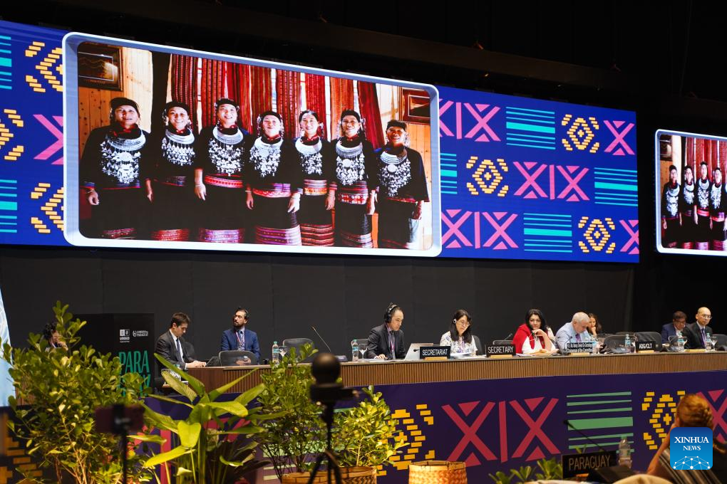 A video on traditional Li textile techniques: spinning, dyeing, weaving and embroidering is played during the 19th session of the Intergovernmental Committee for the Safeguarding of Intangible Cultural Heritage in Asuncion, Paraguay, Dec. 5, 2024. UNESCO added on Thursday traditional Li textile techniques: spinning, dyeing, weaving and embroidering to its Representative List of the Intangible Cultural Heritage of Humanity. It was included in 2009 in the List of Intangible Cultural Heritage in Need of Urgent Safeguarding. (Xinhua/Zhu Yubo)