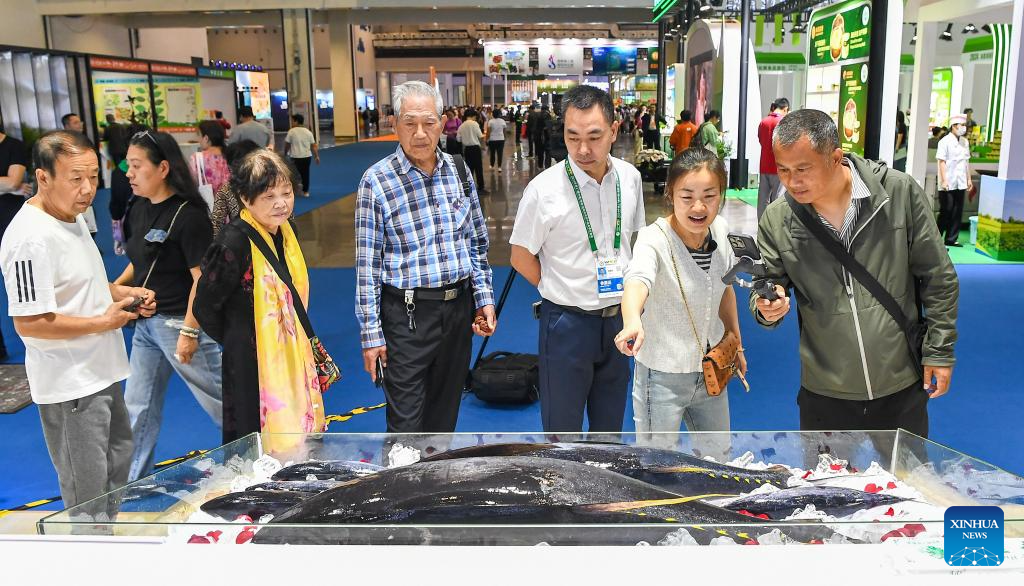 Visitors look at yellowfin tunas at the 27th China (Hainan) International Winter Trade Fair for Tropical Agricultural Products in Haikou, south China's Hainan Province, Dec. 5, 2024. The trade fair opened here on Thursday. (Xinhua/Yang Guanyu)