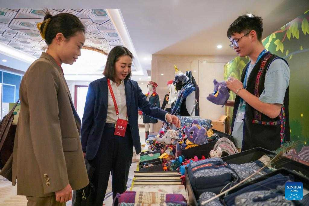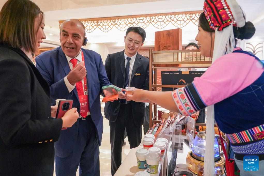 Participants attending the 3rd Yunnan International Communication Forum learn about Yunnan specialty in Xishuangbanna, southwest China's Yunnan Province, Dec. 10, 2024. The 3rd Yunnan International Communication Forum opened here on Tuesday. More than 200 scholars, officials and media representatives from 21 countries attended the forum. (Xinhua/Wang Jingyi)