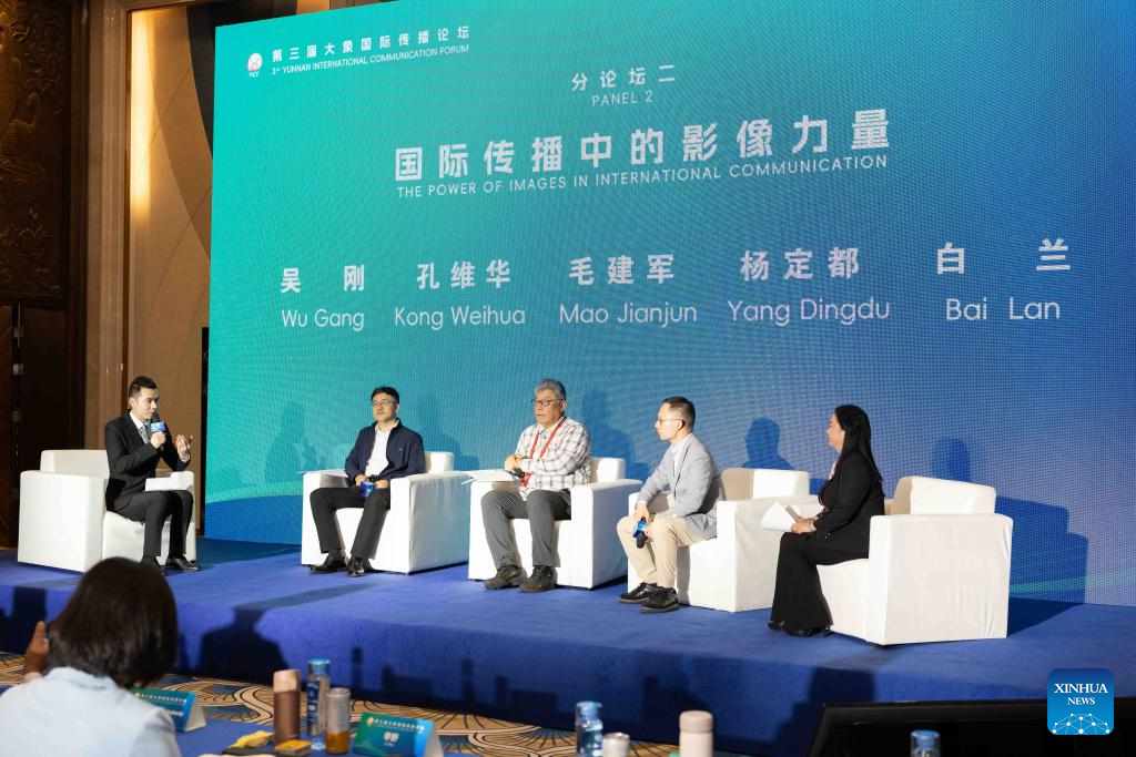 Participants speak on the main forum of the 3rd Yunnan International Communication Forum in Xishuangbanna, southwest China's Yunnan Province, Dec. 10, 2024. The 3rd Yunnan International Communication Forum opened here on Tuesday. More than 200 scholars, officials and media representatives from 21 countries attended the forum. (Xinhua/Xin Yuewei)