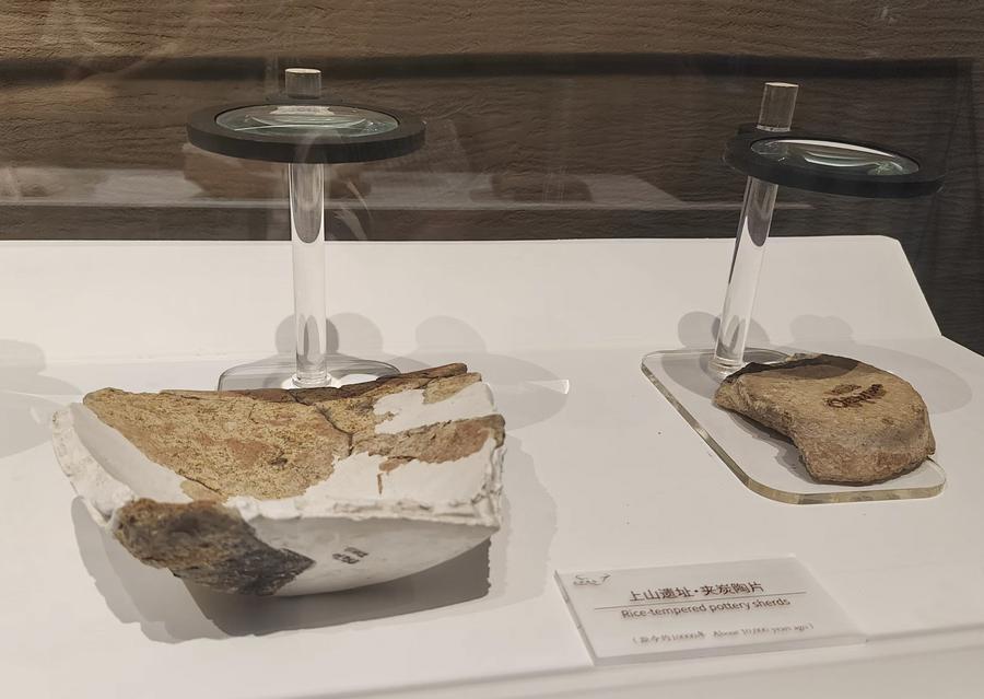 This photo taken on May 24, 2024 shows rice-tempered ceramic sherds unearthed at the Shangshan site in Pujiang County, east China's Zhejiang Province. (Xinhua/Feng Yuan)