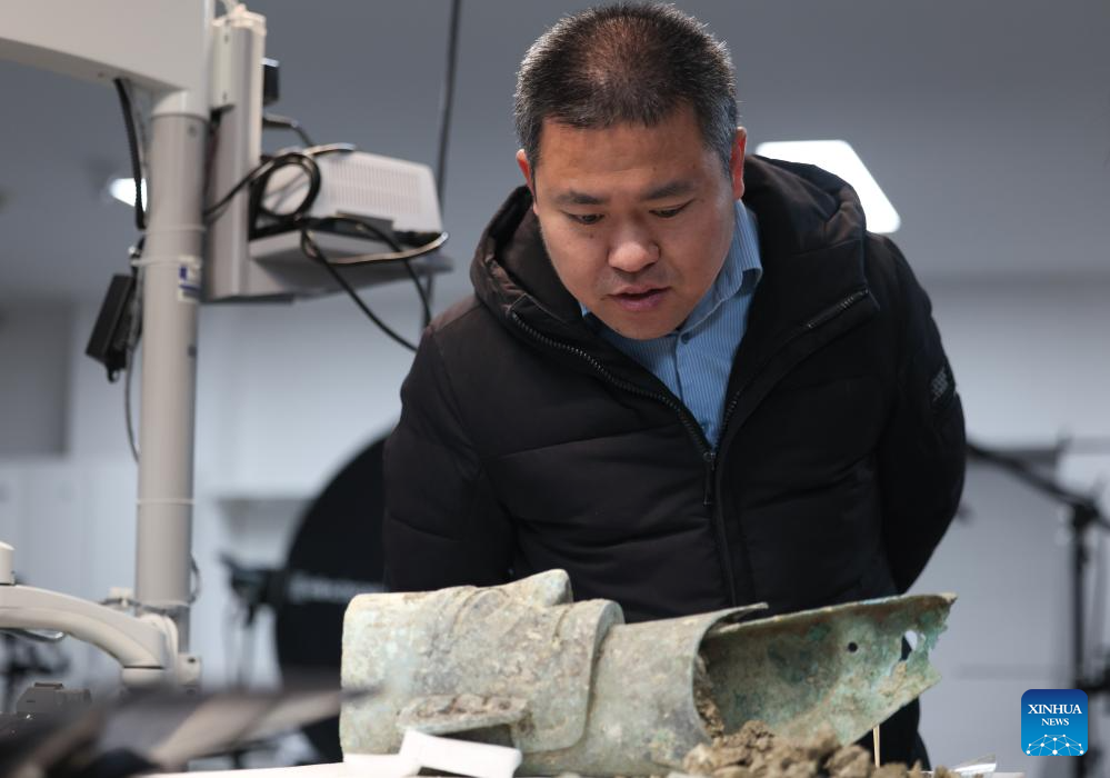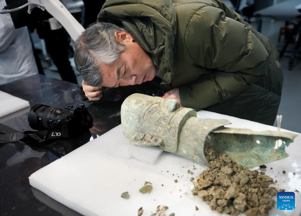 Staff members restore a bronze relic at a research institute of Sanxingdui ruins in Guanghan City, southwest China's Sichuan Province, Dec. 16, 2024. The second phase of the conservation and inheritance project of Ancient Shu Civilization was launched here on Monday. In the next three years, excavations and researches will be organized to explore the uncharted territories in the functional areas and important relics of Sanxingdui and Jinsha ruins. Jinsha ruins, together with the Sanxingdui ruins, are peaks of ancient Shu culture and represent the two most glorious periods of the ancient Shu Kingdom that suddenly disappeared about 2,000 years ago. (Xinhua/Jiang Hongjing)
