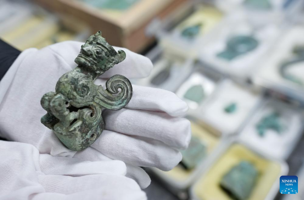 A staff member displays a bronze relic at a research institute of Sanxingdui ruins in Guanghan City, southwest China's Sichuan Province, Dec. 16, 2024. The second phase of the conservation and inheritance project of Ancient Shu Civilization was launched here on Monday. In the next three years, excavations and researches will be organized to explore the uncharted territories in the functional areas and important relics of Sanxingdui and Jinsha ruins. Jinsha ruins, together with the Sanxingdui ruins, are peaks of ancient Shu culture and represent the two most glorious periods of the ancient Shu Kingdom that suddenly disappeared about 2,000 years ago. (Xinhua/Jiang Hongjing)