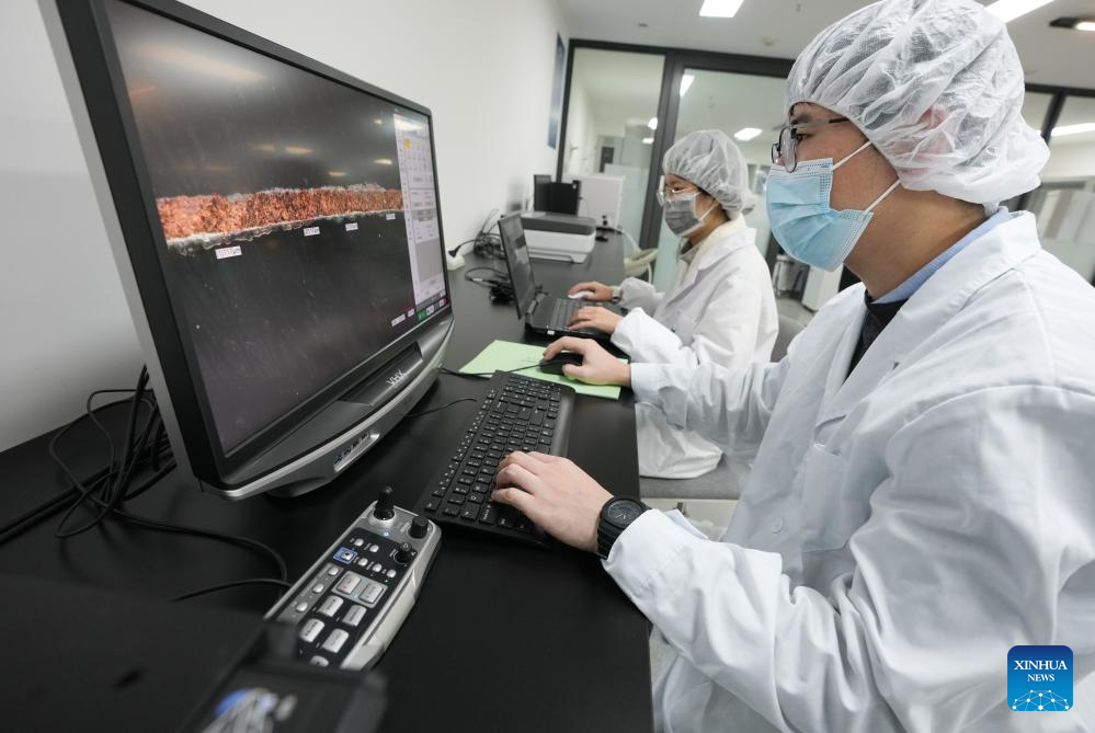 Archaeologists examine samples of bronze pieces with different alloy proportions at a research institute of Sanxingdui ruins in Guanghan City, southwest China's Sichuan Province, Dec. 16, 2024. The second phase of the conservation and inheritance project of Ancient Shu Civilization was launched here on Monday. In the next three years, excavations and researches will be organized to explore the uncharted territories in the functional areas and important relics of Sanxingdui and Jinsha ruins. Jinsha ruins, together with the Sanxingdui ruins, are peaks of ancient Shu culture and represent the two most glorious periods of the ancient Shu Kingdom that suddenly disappeared about 2,000 years ago. (Xinhua/Jiang Hongjing)