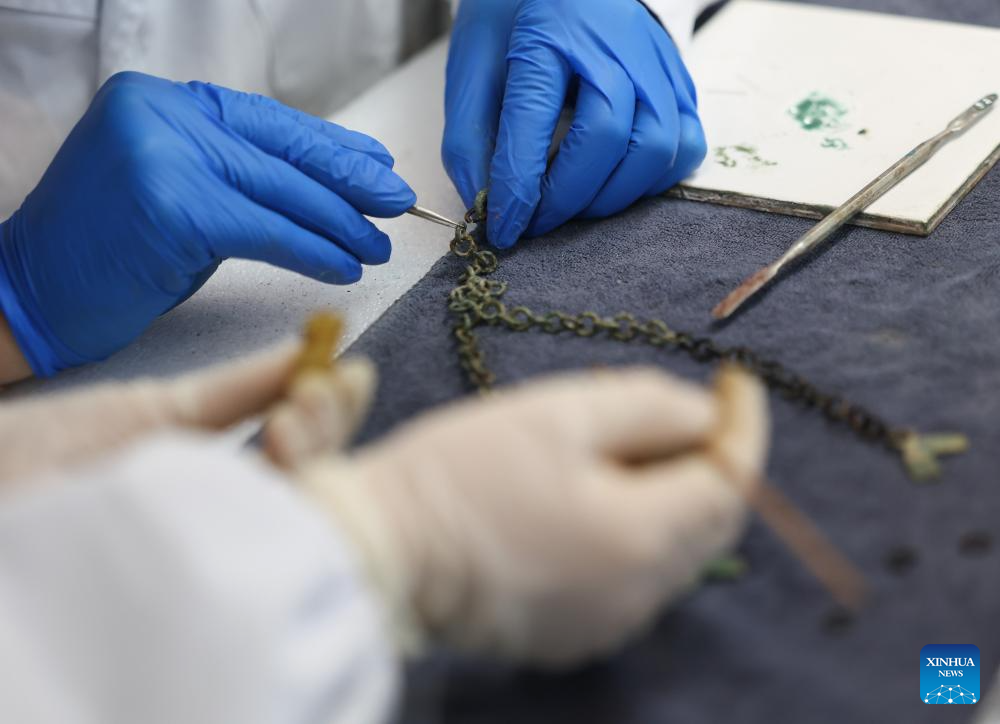 Staff members restore bronze relics at a research institute of Sanxingdui ruins in Guanghan City, southwest China's Sichuan Province, Dec. 16, 2024. The second phase of the conservation and inheritance project of Ancient Shu Civilization was launched here on Monday. In the next three years, excavations and researches will be organized to explore the uncharted territories in the functional areas and important relics of Sanxingdui and Jinsha ruins. Jinsha ruins, together with the Sanxingdui ruins, are peaks of ancient Shu culture and represent the two most glorious periods of the ancient Shu Kingdom that suddenly disappeared about 2,000 years ago. (Xinhua/Jiang Hongjing)