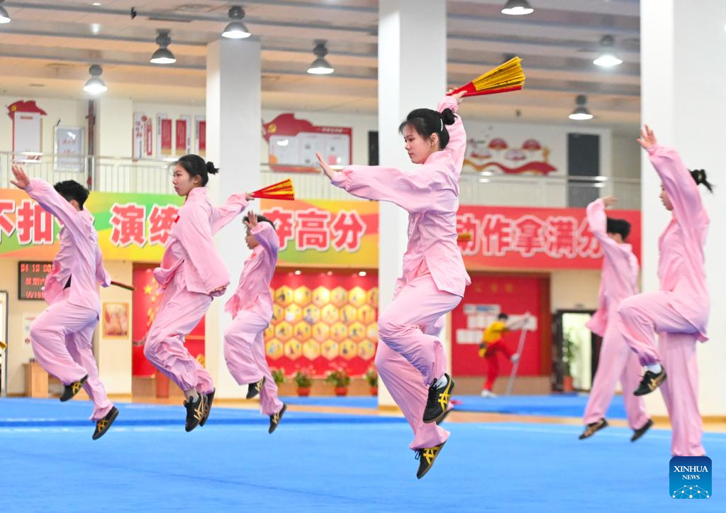 Chinese athletes perform Tai Chi fan in Fuzhou, southeast China's Fujian Province, Dec. 28, 2024. Young people from China and U.S. attended a martial arts cultural exchange event here on Saturday. (Xinhua/Lin Shanchuan)