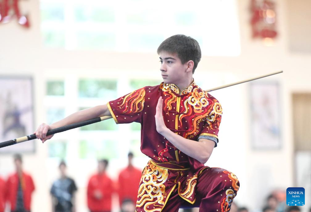 An American youth performs Gunshu in Fuzhou, southeast China's Fujian Province, Dec. 28, 2024. Young people from China and U.S. attended a martial arts cultural exchange event here on Saturday. (Xinhua/Lin Shanchuan)